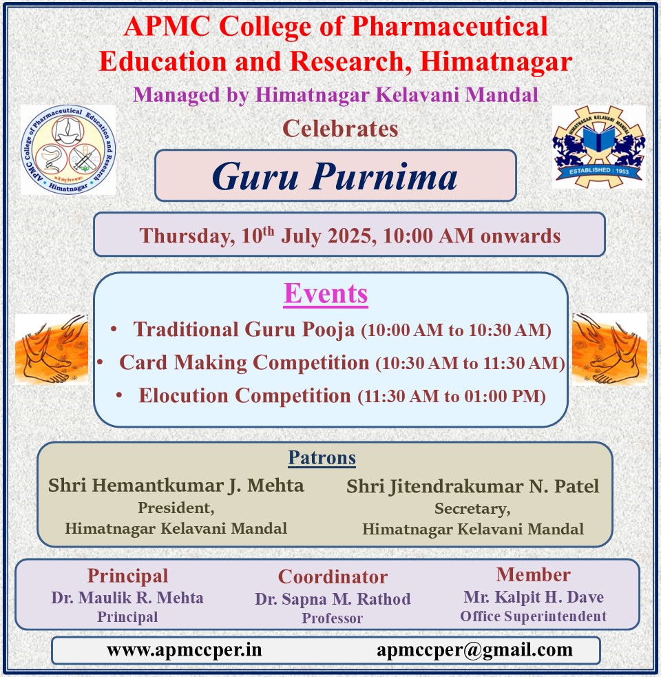 APMC College of Pharmaceutical Education & Research, Himatnagar Established in 2000 - the millennium year - to bring light, foresight and bright future in the field of PHARMACY. From year 2000 onwards - it has marched firm footed through all these year till date. Almost 500 students from this institution have successfully entered the competitive pharmacy world. They are confidently facing the day to day challenge of ever-growing field of pharmacy may it be in Research, Manufacturing & Production, Academics, Pharmacists, Retail Chemists and almost all facets with great endeavor and prudence.